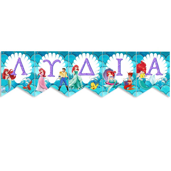 Διακοσμητικά σημαιάκια με το όνομα της μικρής σας και θέμα την μικρή γοργόνα.