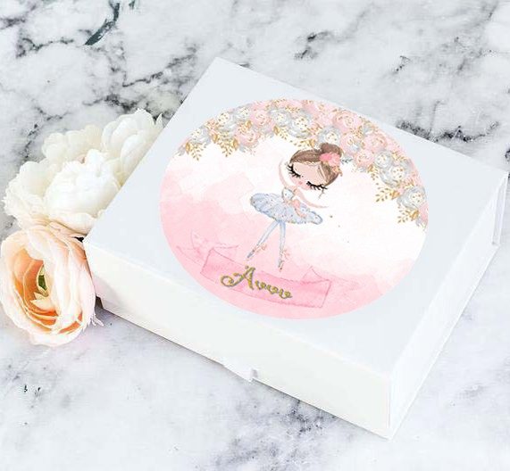 Στρογγυλά προσωποποιημένα αυτοκόλλητα με θέμα Μπαλαρίνα. Μπορείτε να τα χρησιμοποιήσετε σε κουτάκια μπομπονιέρας, σε μπουκάλια και ποτήρια ή σε οποιοδήποτε άλλο αντικείμενο θέλετε να διακοσμήσετε για τη βάπτιση ή το πάρτυ.