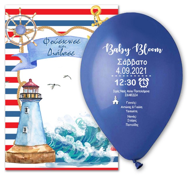 Πρωτότυπο προσκλητήριο βάπτισης σε τυπωμένο μπαλόνι με θέμα Ναυτικό. Οι καλεσμένοι θα πρέπει να φουσκώσουν το τυπωμένο μπαλόνι για να μάθουν τις λεπτομέρειες της βάπτισης!