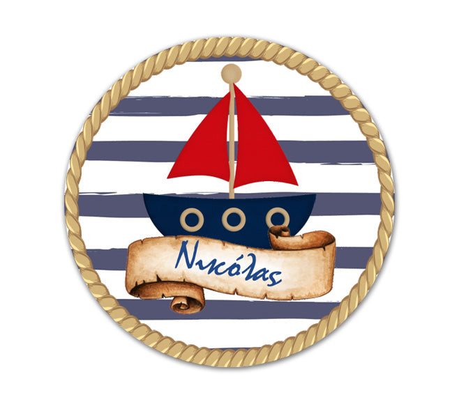 Στρογγυλά προσωποποιημένα αυτοκόλλητα με Ναυτικό θέμα. Μπορείτε να τα χρησιμοποιήσετε σε κουτάκια μπομπονιέρας, σε μπουκάλια και ποτήρια ή σε οποιοδήποτε άλλο αντικείμενο θέλετε να διακοσμήσετε για τη βάπτιση ή το πάρτυ.