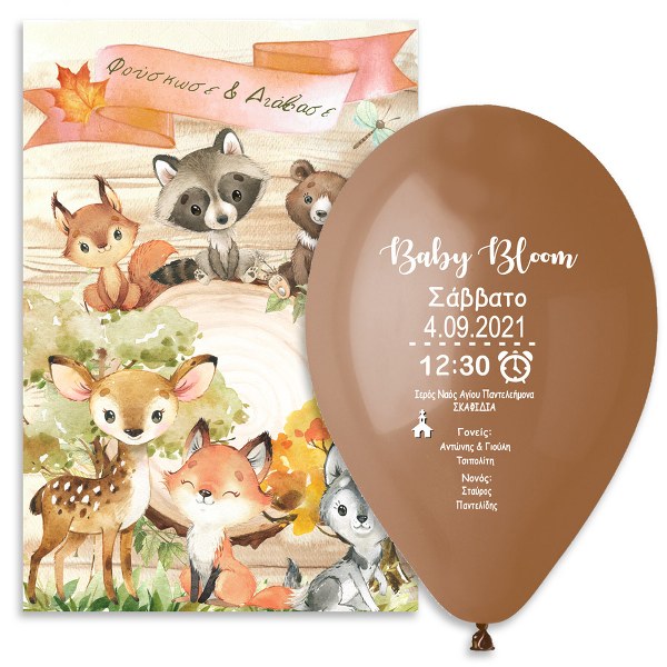 Πρωτότυπο προσκλητήριο βάπτισης σε τυπωμένο μπαλόνι με θέμα Ζώα του Δάσους. Οι καλεσμένοι θα πρέπει να φουσκώσουν το τυπωμένο μπαλόνι για να μάθουν τις λεπτομέρειες της βάπτισης!