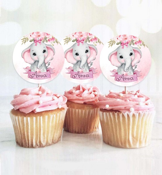Topper-Οδοντογλυφίδες για να στολίσετε τα ζαχαρωτά και τα cupcake του μπουφέ με θέμα χαριτωμένο ελεφαντάκι κορίτσι.
