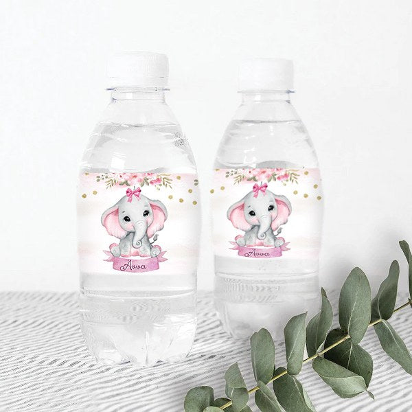 Προσωποποιημένες ετικέτες για μπουκαλάκια νερού με θέμα Ελεφαντάκι κορίτσι, για να κεραστούν οι καλεσμένοι σας!