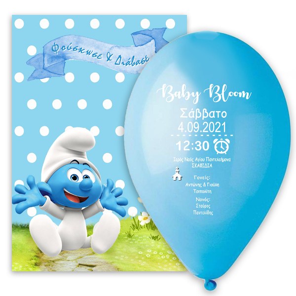 Πρωτότυπο προσκλητήριο βάπτισης σε τυπωμένο μπαλόνι με θέμα Baby Στρουμφάκια. Οι καλεσμένοι θα πρέπει να φουσκώσουν το τυπωμένο μπαλόνι για να μάθουν τις λεπτομέρειες της βάπτισης!