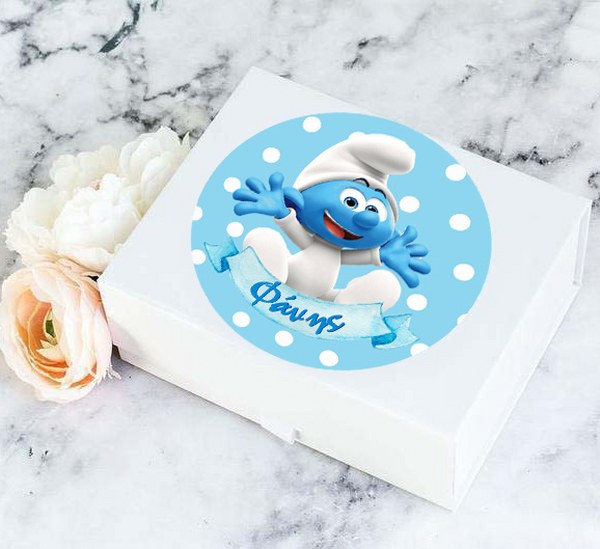 Στρογγυλά προσωποποιημένα αυτοκόλλητα με θέμα Στρουμφάκι. Μπορείτε να τα χρησιμοποιήσετε σε κουτάκια μπομπονιέρας, σε μπουκάλια και ποτήρια ή σε οποιοδήποτε άλλο αντικείμενο θέλετε να διακοσμήσετε για τη βάπτιση ή το πάρτυ.