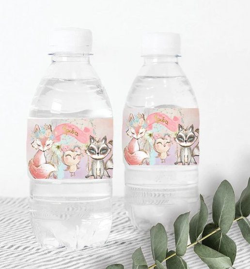 Προσωποποιημένες ετικέτες για μπουκαλάκια νερού με θέμα Boho Woodland, για να κεραστούν οι καλεσμένοι σας!