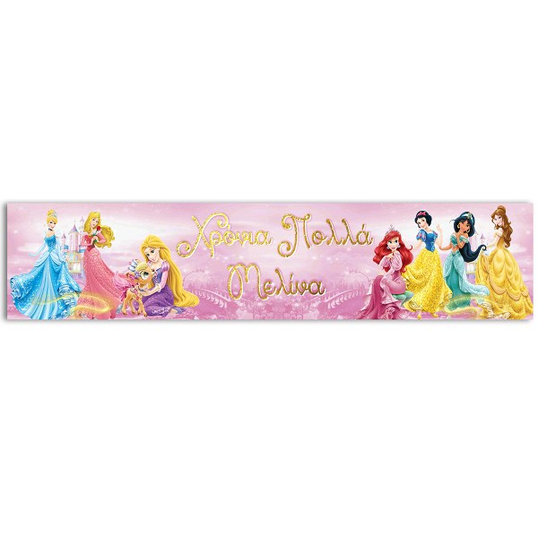 Προσωποποιημένο banner, με θέμα τις αγαπημένες Πριγκίπισσες της μικρής σου. Μπορεί να χρησιμοποιηθεί ως runner για τη διακόσμηση του τραπεζιού ή ως banner στην πόρτα ή τον τοίχο.