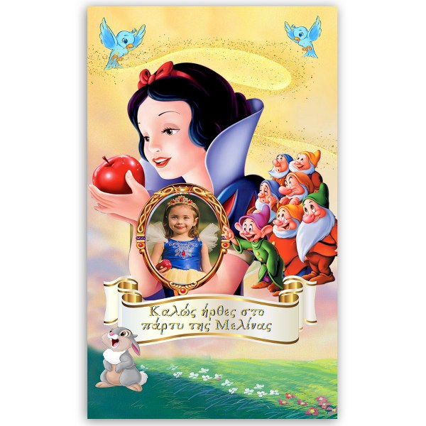 Μεγάλη διακοσμητική αφίσα με θέμα τη Χιονάτη και εκτυπωμένη τη φωτογραφία της μικρής σας, για να υποδεχθείτε τους καλεσμένους σας στο πάρτυ γενεθλίων!
