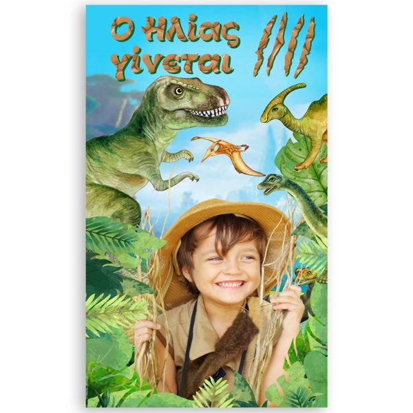 Μεγάλη διακοσμητική αφίσα με θέμα τους Δεινόσαυρους και εκτυπωμένη τη φωτογραφία του μικρού σας, για να υποδεχθείτε τους καλεσμένους σας στο πάρτυ γενεθλίων!