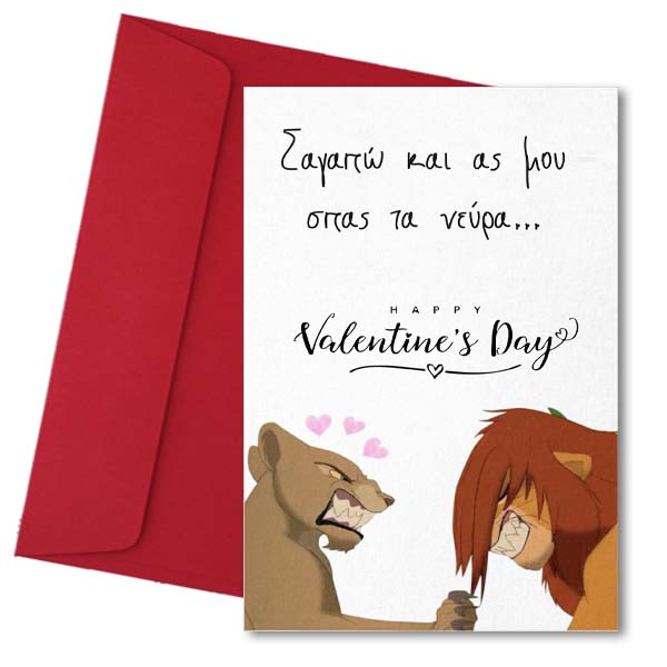 Εκφράστε την αγάπη σας στο ταίρι σας με χιουμοριστική κάρτα με λιονταράκια "Σ 'αγαπώ κι ας μου σπας τα νεύρα".