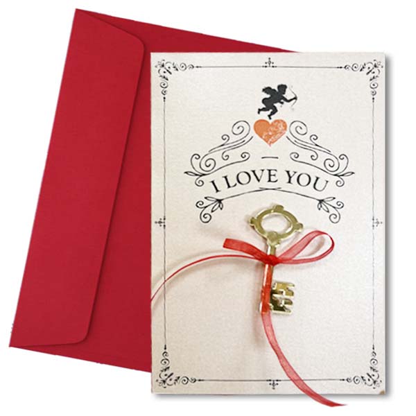 Ευχετήρια κάρτα Ι Love You, με χρυσό κλειδί από plexiglass-καθρέπτη.