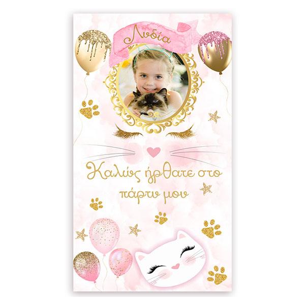 Μεγάλη διακοσμητική αφίσα με θέμα Γατούλα και εκτυπωμένη τη φωτογραφία του μικρού σας, για να υποδεχθείτε τους καλεσμένους σας στο πάρτυ γενεθλίων!