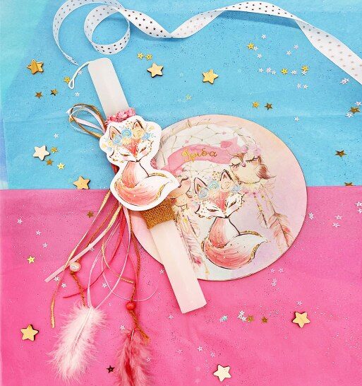 - H λαμπάδα φέρει ξύλινο διακοσμητικό αλεπουδάκι (Διαστάσεις: 15 cm) και κορδέλες σε αντίστοιχα χρώματα