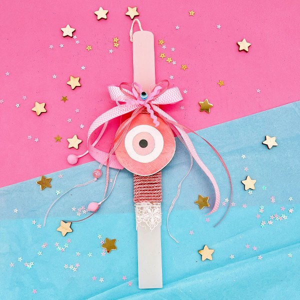 Πασχαλινή Λαμπάδα Ματάκι ροζ, με υπέροχα υλικά και κορδέλες, που θα κλέψει τις εντυπώσεις και θα γεμίσει με χαμόγελα νονούς και παιδιά!