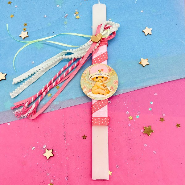 Λαμπάδα μωράκι Sarah Kay, με υπέροχα υλικά και κορδέλες, που θα κλέψει τις εντυπώσεις και θα γεμίσει με χαμόγελα νονούς και παιδιά!