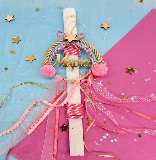 - Η λαμπάδα είναι διακοσμημένη με κορδέλες σε ροζ αποχρώσεις που σχηματίζουν ουράνιο τόξο