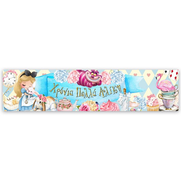Banner πάρτυ με την Αλίκη στη χώρα των Θαυμάτων, και τυπωμένο το μήνυμα της επιλογής σας! Μπορεί να χρησιμοποιηθεί ως runner για τη διακόσμηση του τραπεζιού ή ως banner στην πόρτα ή τον τοίχο.
