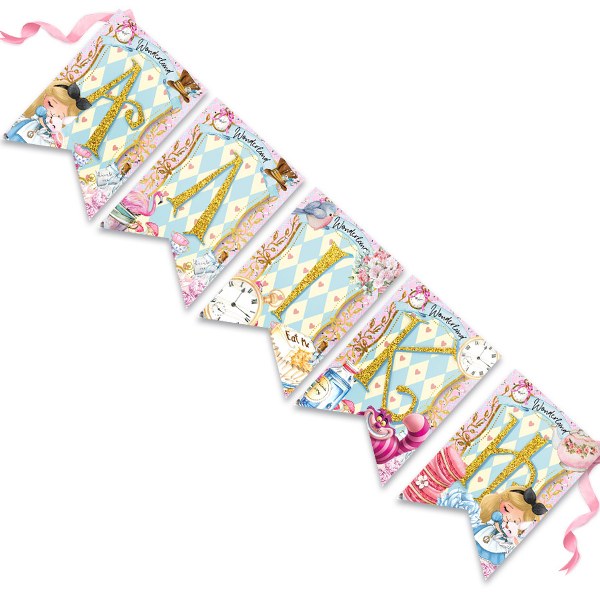 Διακοσμητικά σημαιάκια με το όνομα του παιδιού και θέμα την Αλίκη στη Χώρα των Θαυμάτων για τη διακόσμηση του πάρτυ, της βάπτισης ή του παιδικού δωματίου!