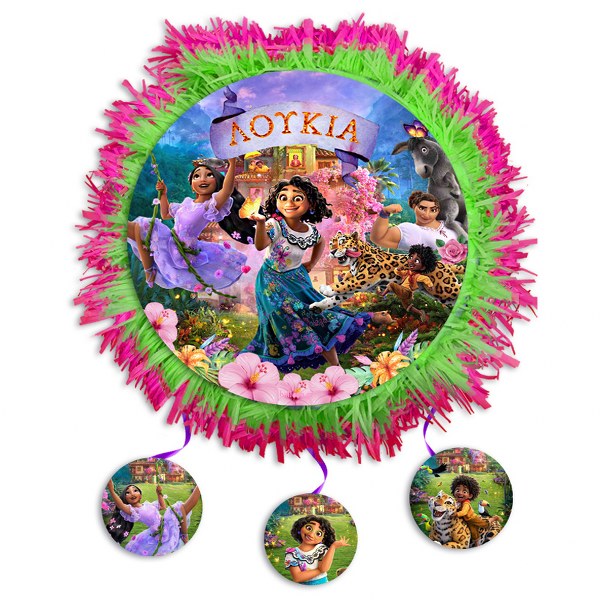 • Από την πινιάτα κρέμονται 3 στρογγυλά διακοσμητικά από χαρτόνι με τύπωμα στο θέμα της πινιάτας