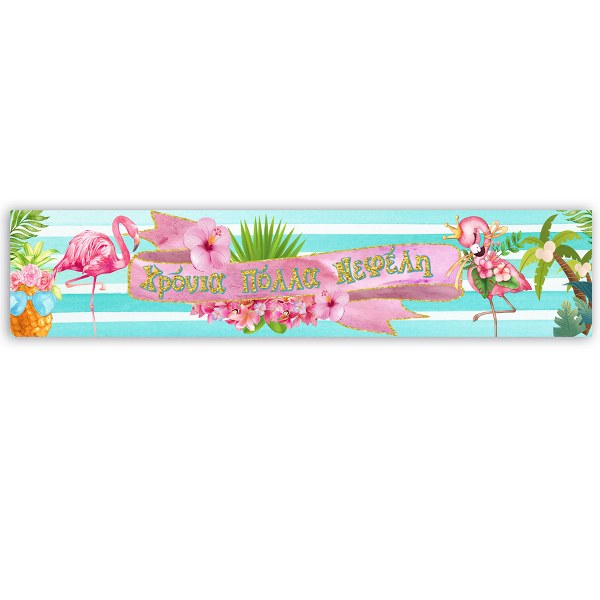 Banner πάρτυ με θέμα Φλαμίνγκο, και τυπωμένο το μήνυμα της επιλογής σας! Μπορεί να χρησιμοποιηθεί ως runner για τη διακόσμηση του τραπεζιού ή ως banner στην πόρτα ή τον τοίχο.