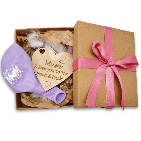 To κουτάκι είναι στολισμένο με ροζ κορδέλα και περιλαμβάνει: 1 ξύλινο μπρελόκ με χάραξη "Mum I love you to the moon and back", 1 μπαλόνι με εκτύπωση "Best Mum" και διακοσμητικά πούπουλα