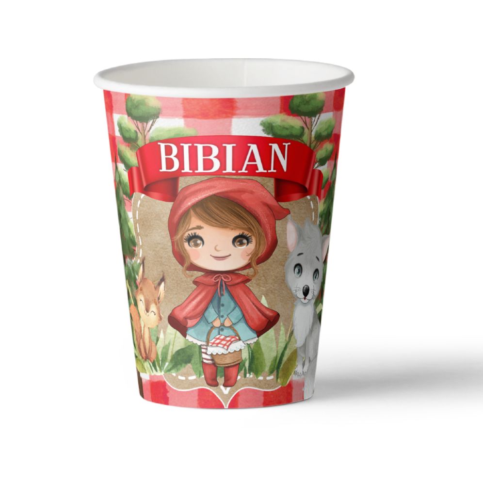 Ποτηράκια με το όνομα του μικρού σας και θέμα την Κοκκινοσκουφίτσα, για να κεράσετε τους καλεσμένους σας στο τραπέζι του πάρτυ!