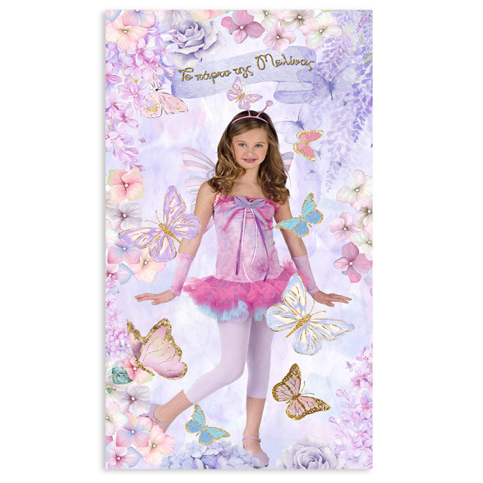 Μεγάλη διακοσμητική αφίσα με θέμα Πεταλούδα και εκτυπωμένη τη φωτογραφία της μικρής σας, για να υποδεχθείτε τους καλεσμένους σας στο πάρτυ γενεθλίων!