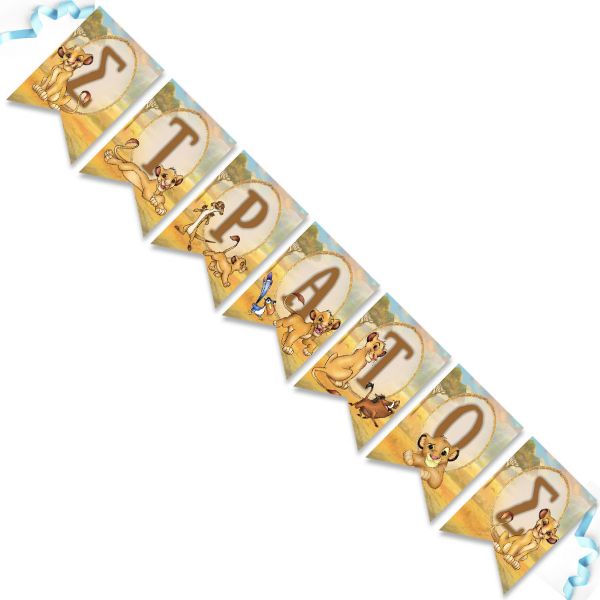 Διακοσμητικά σημαιάκια με το όνομα του παιδιού και θέμα Lion King για να στολίσετε τον μπουφέ της βάπτισής σας!
