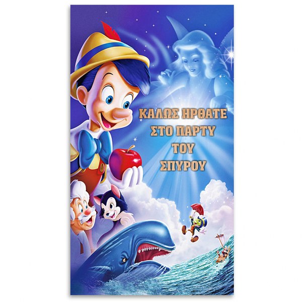 Μεγάλη διακοσμητική αφίσα με θέμα Πινόκιο και εκτυπωμένη τη φωτογραφία του παιδιού, για να υποδεχθείτε τους καλεσμένους σας στο πάρτυ γενεθλίων!
