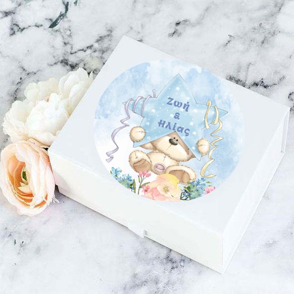 Στρογγυλά προσωποποιημένα αυτοκόλλητα με θέμα Αρκουδάκι. Μπορείτε να τα χρησιμοποιήσετε σε κουτάκια μπομπονιέρας, σε μπουκάλια και ποτήρια ή σε οποιοδήποτε άλλο αντικείμενο θέλετε να διακοσμήσετε για τη βάπτιση ή το πάρτυ.
