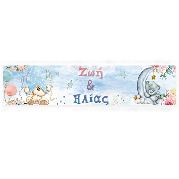 Banner με θέμα Αρκουδάκι και τυπωμένο το μήνυμα της επιλογής σας! Μπορεί να χρησιμοποιηθεί ως runner για τη διακόσμηση του τραπεζιού της βάπτισης ή ως banner στην πόρτα ή τον τοίχο.