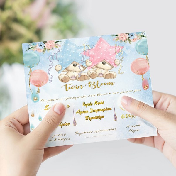 Τετράγωνο προσκλητήριο βάπτισης με θέμα Αρκουδάκι, για να προσκαλέσετε τα αγαπημένα σας άτομα στην βάπτιση των δίδυμων μωρών σας!