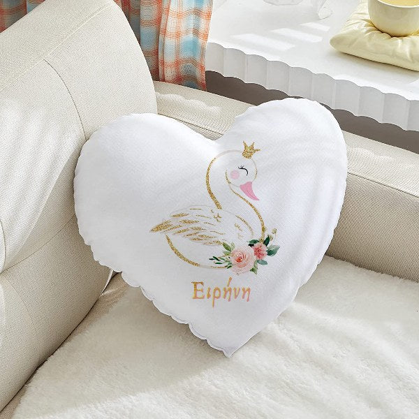 Μαξιλάρι σε σχήμα καρδιάς με θέμα Κύκνος και τυπωμένο το όνομα, για να προσφέρετε ως δώρο ή να το διακοσμήσετε στη βάπτιση του μωρού σας!