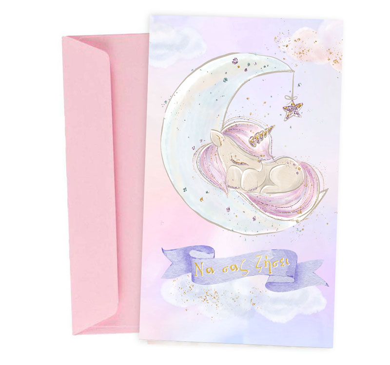 Ευχετήρια κάρτα με χαριτωμένο Μονοκεράκι, για να γράψετε τις πιο θερμές ευχές σας για τη βάπτιση ή τη γέννηση.