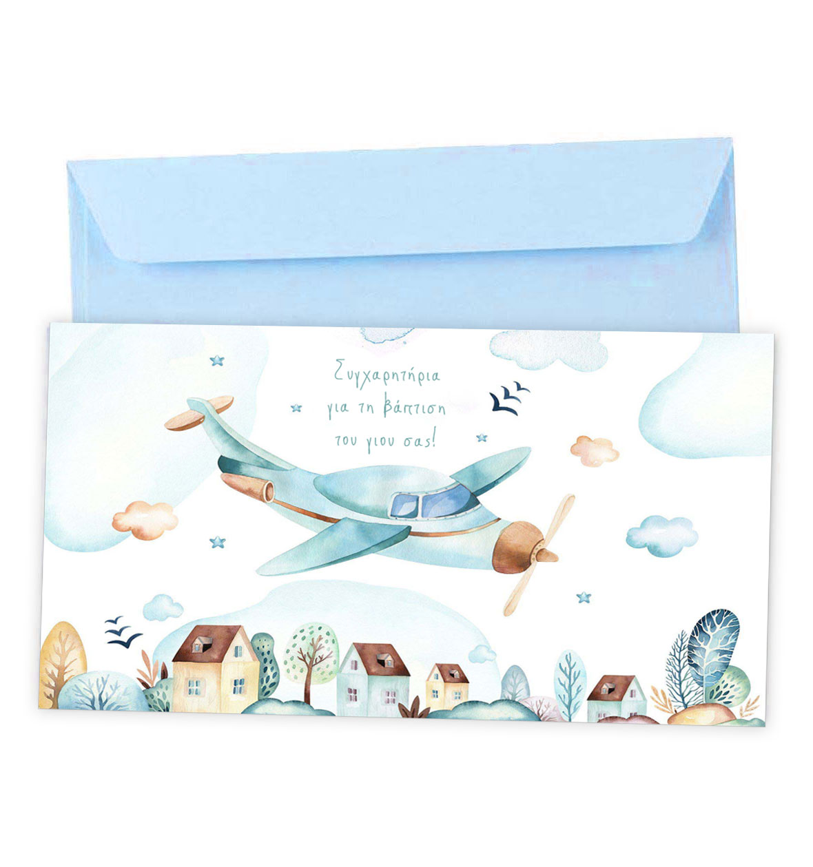 Ευχετήρια κάρτα για γέννηση ή βάπτιση σε αγοράκι, με σχέδιο watercolor αεροπλανάκι.