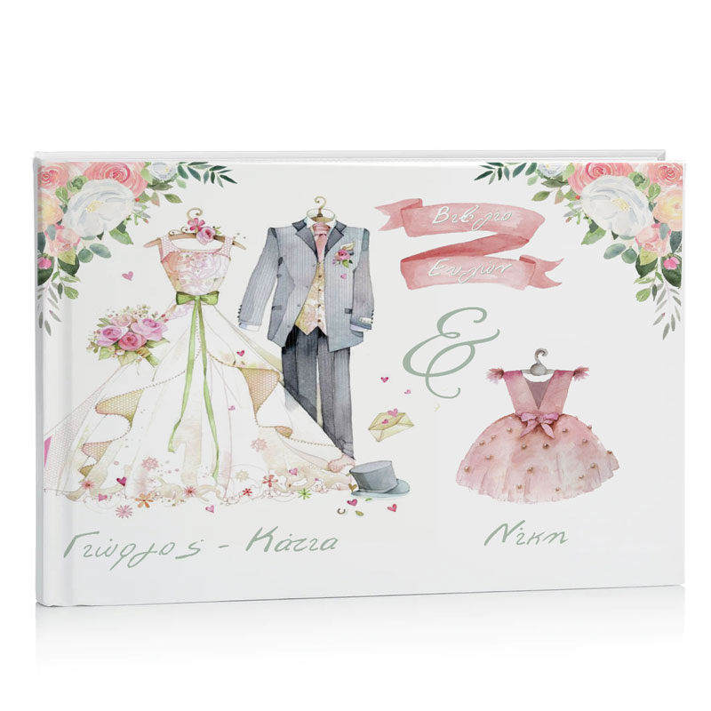 Εντυπωσιακό, βιβλίο ευχών για Γάμο και Βάπτιση, με σχέδιο τα γαμπριάτικα ρούχα και το βαπτιστικό φουστανάκι της μικρής σας. Κρατήστε για πάντα τις ευχές των καλεσμένων σας σε ένα όμορφο ευχολόγιο.