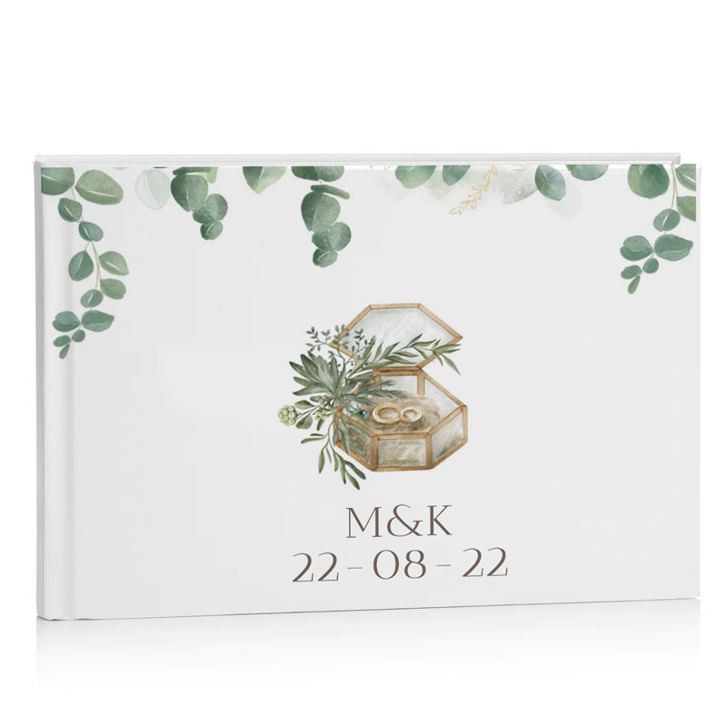 Βιβλίο Ευχών με τα αρχικά και την ημερομηνία των νεόνυμφων και σχέδιο κουτί με βέρες και ευκάλυπτος. Κρατήστε για πάντα τις ευχές των καλεσμένων σας σε ένα όμορφο ευχολόγιο.