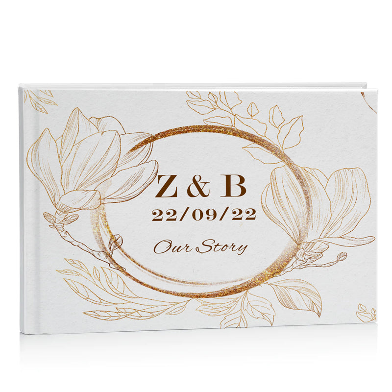 Βιβλίο Ευχών με τα αρχικά και την ημερομηνία των νεόνυμφων και σχέδιο με χρυσές παιώνιες. Κρατήστε για πάντα τις ευχές των καλεσμένων σας σε ένα όμορφο ευχολόγιο.