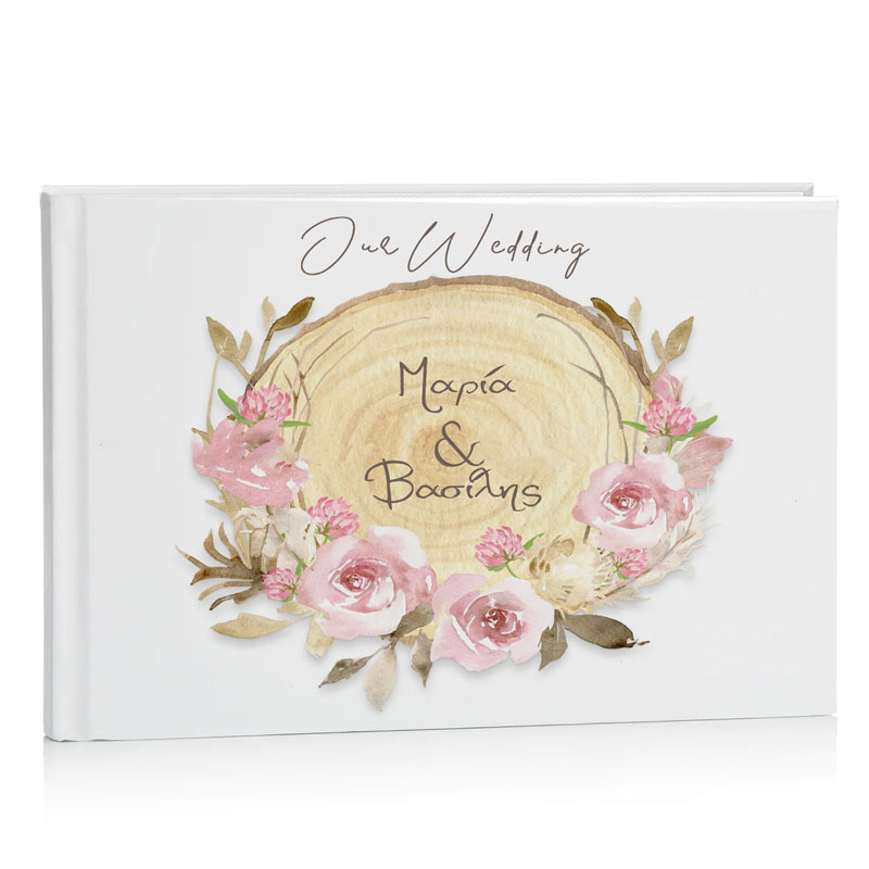 Βιβλίο Ευχών με τα ονόματα των νεόνυμφων και σχέδιο κορμό δέντρου με λουλούδια. Κρατήστε για πάντα τις ευχές των καλεσμένων σας σε ένα όμορφο ευχολόγιο.