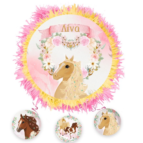 • Από την πινιάτα κρέμονται 3 στρογγυλά διακοσμητικά από χαρτόνι με τύπωμα στο θέμα της πινιάτας
