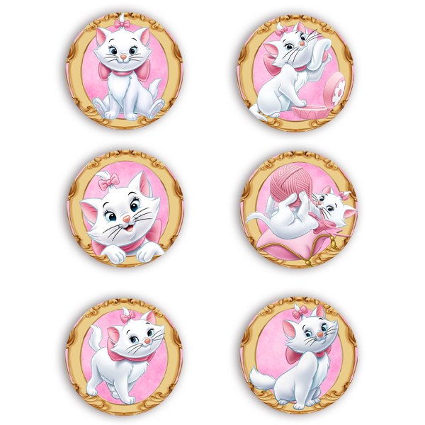 Σετ κονκάρδες με τη γατούλα Marie από την αγαπημένη ταινία της Disney Αριστόγατες, ιδανικές για δωράκι στους καλεσμένους ή για να διακοσμήσετε με αυτές τα αγαπημένα σας αντικείμενα!
