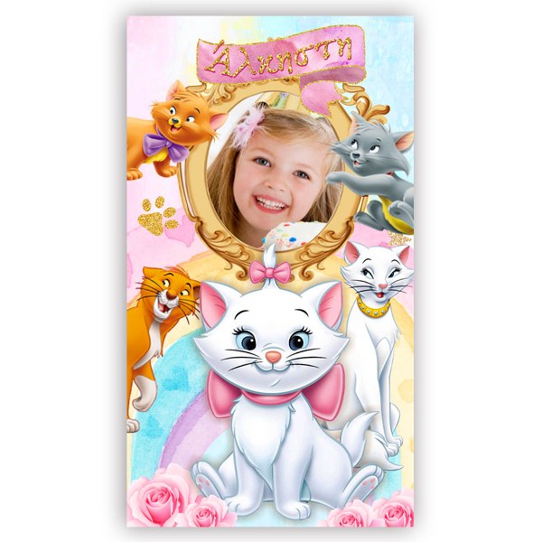 Μεγάλη διακοσμητική αφίσα με θέμα Αριστόγατες και εκτυπωμένη τη φωτογραφία του μικρού σας, για να υποδεχθείτε τους καλεσμένους σας στο πάρτυ γενεθλίων!