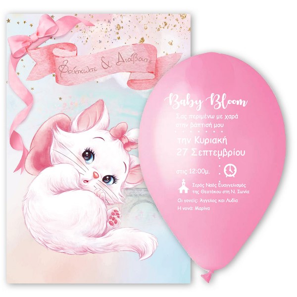 Εάν βαρεθήκατε τα κοινότυπα προσκλητήρια βάπτισης τότε προσκλητήριο μπαλόνι με θέμα Αριστόγατες είναι για εσάς! Οι καλεσμένοι θα πρέπει να φουσκώσουν το τυπωμένο μπαλόνι για να μάθουν τις λεπτομέρειες της βάπτισης!