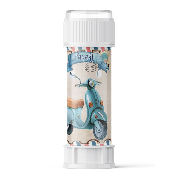 Προσωποποιημένες σαπουνόφουσκες με χάρτινο περιτύλιγμα και θέμα Βέσπα. Μια όμορφη ιδέα για να χαρίσετε ως αναμνηστικό δωράκι στους καλεσμένους της βάπτισης.