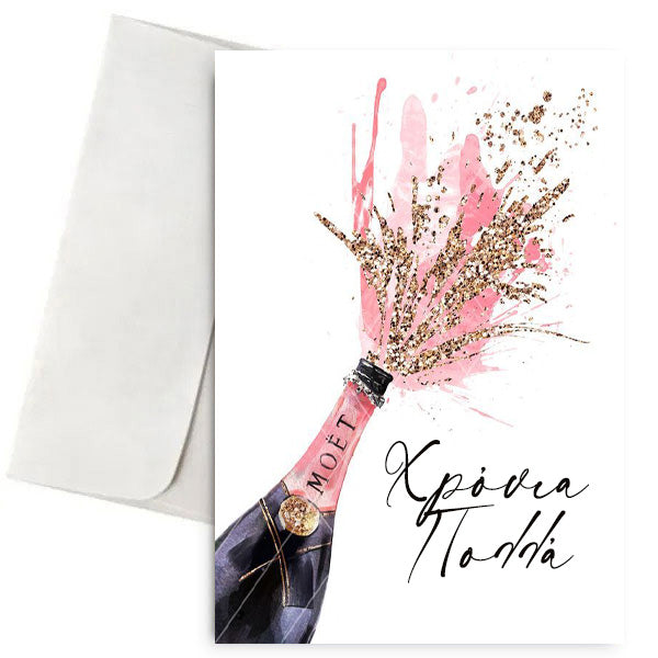Κάρτα γενεθλίων με σχέδιο σαμπάνια σε χρώματα rosegold, για να ευχηθείτε στα αγαπημένα σας άτομα Χρόνια Πολλά !