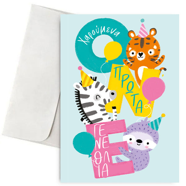 Κάρτα γενεθλίων με χαριτωμένα ζωάκια της ζούγκλας, για να ευχηθείτε Χαρούμενα Πρώτα Γενέθλια!