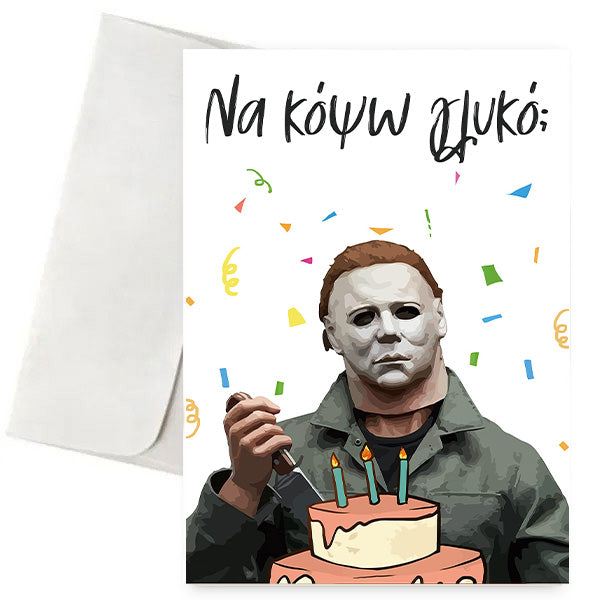 Χιουμοριστική κάρτα γενεθλίων με τον Michael Myers και μήνυμα "Να κόψω γλυκό;"