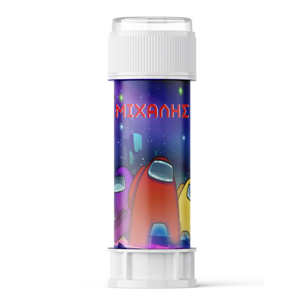 Προσωποποιημένες σαπουνόφουσκες με χάρτινο περιτύλιγμα και θέμα Among Us, για να χαρίσετε ως αναμνηστικό δωράκι στους μικρούς καλεσμένους του πάρτυ.