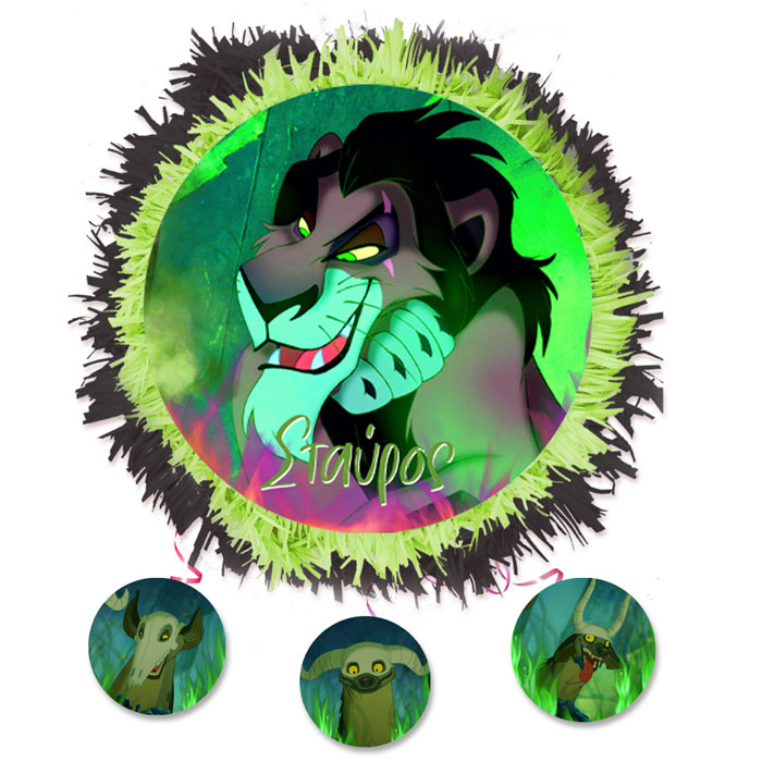• Από την πινιάτα κρέμονται 3 στρογγυλά διακοσμητικά από χαρτόνι με τύπωμα στο θέμα της πινιάτας