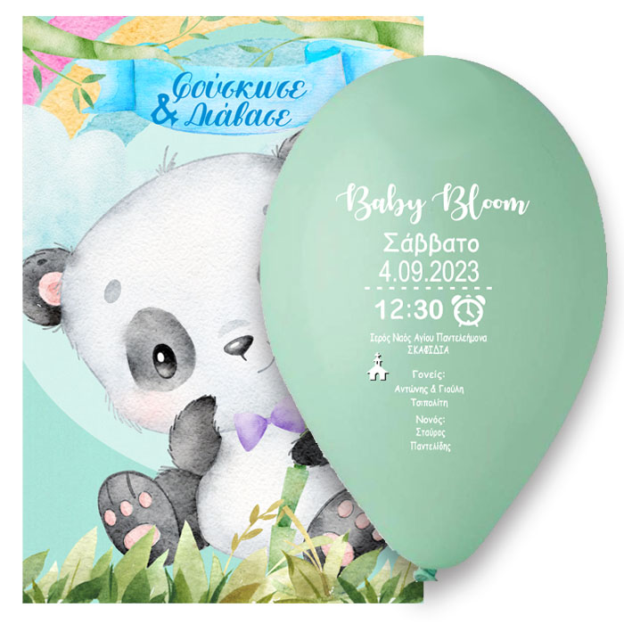 Πρωτότυπο προσκλητήριο βάπτισης σε τυπωμένο μπαλόνι με θέμα χαριτωμένο Panda Rainbow. Οι καλεσμένοι θα πρέπει να φουσκώσουν το τυπωμένο μπαλόνι για να μάθουν τις λεπτομέρειες της βάπτισης!